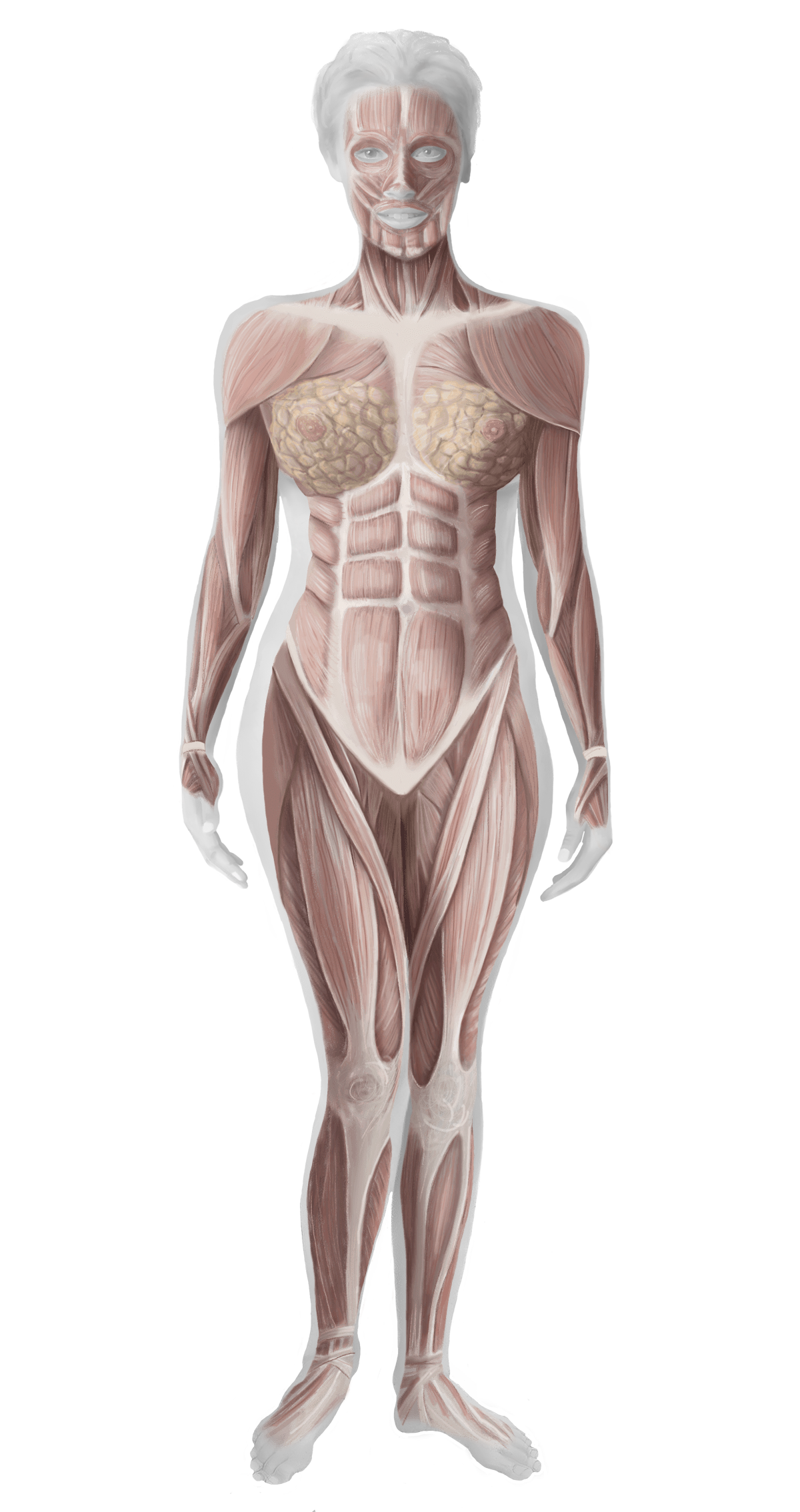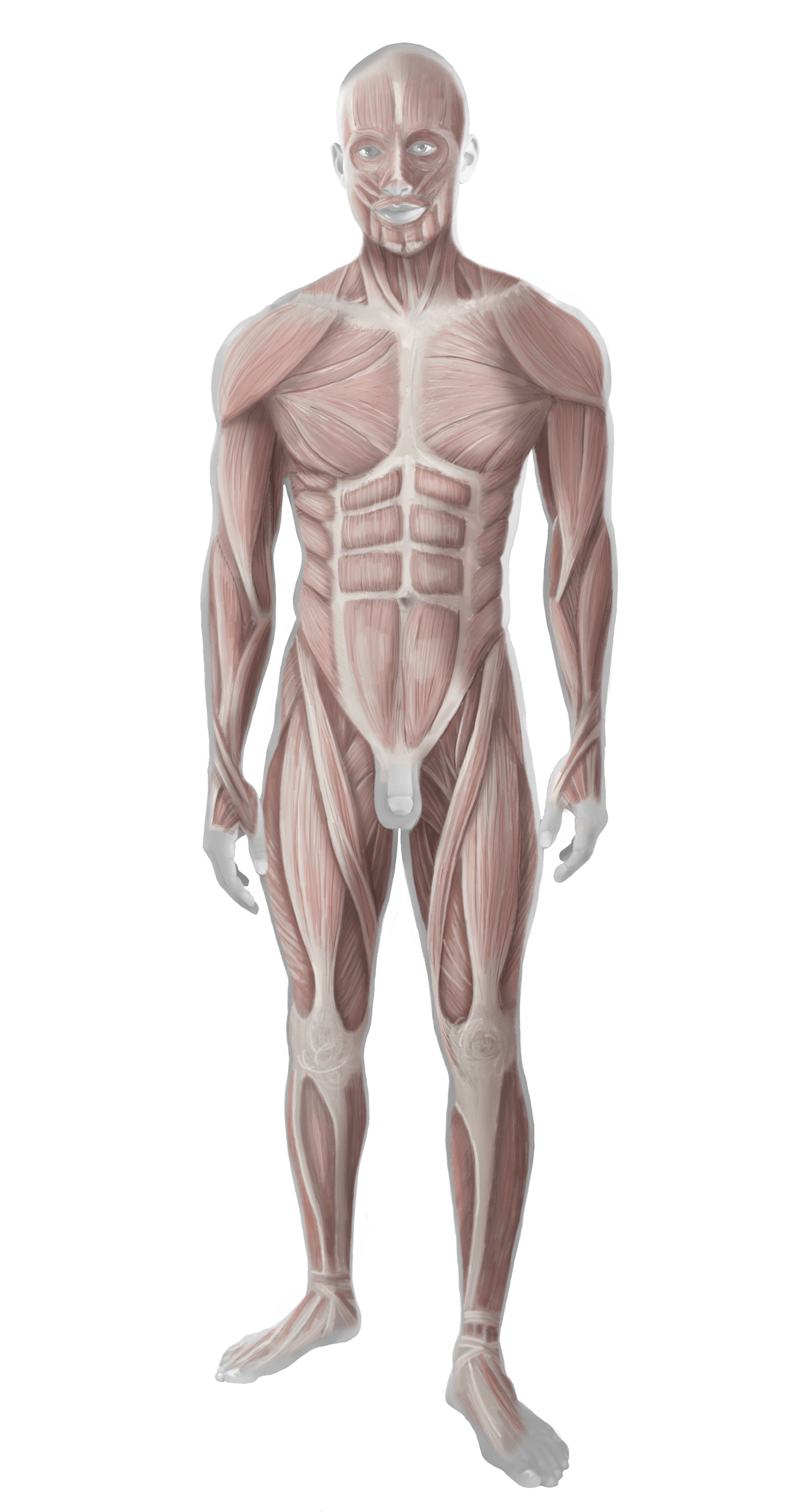 Der menschliche Körper hat über 600 Muskeln, die drei verschiedene Muskeltypen umfassen: Die Skelettmuskulatur, die alle willkürlichen Bewegungen ausführt; die glatte Muskulatur in den Wänden vieler Hohlorgane wie Speiseröhre, Magen, Darm, Harnblase oder Blutgefässe, und die Herzmuskulatur. Die Skelettmuskeln sind über Sehnen zur Kraftübertragung fest an Knochen verankert, einige sind direkt an der Haut befestigt, wie z.B. die Gesichtsmuskeln für die Gesichtsmimik. Die Skelettmuskeln ermöglichen Bewegungen, geben dem Körper Spannung und Kraft und verleihen ihm ein typisches Erscheinungsbild. Die glatte Muskulatur der Hohlorgane ist nicht willentlich beeinflussbar, sie wird automatisch vom autonomen Nervensystem gesteuert. Sie sind bei den verschiedenste Körperfunktionen beteiligt wie Verdauung, Harnentleerung oder regulieren die Weite der Blutgefässe. Der Herzmuskel gewährleistet die Pumpfunktion des Herzens, er ermüdet nicht und kann ebenfalls nicht willentlich gesteuert werden.