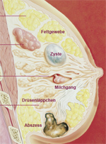 Die weibliche Brustdrüse (Mamma) besteht aus Drüsengewebe, Fett und Bindegewebe. Die sogenannten Drüsenläppchen (Lobuli) des Drüsengewebes produzieren die Muttermilch und münden in kleine Kanäle (Ductus). Die Kanäle führen gebündelt zur Brustwarze. Neben Blutgefässen und Nerven, durchziehen auch Lymphbahnen die Brust. Diese bestehen aus Lymphgefässen und Lymphknoten und verlaufen hauptsächlich in Richtung Achselhöhle.