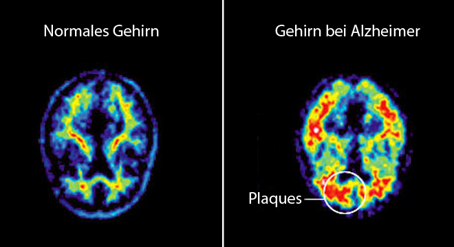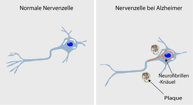 Durch Eiweiss-Ablagerungen (sogenannte amyloide Plaques) kommt es zu Störungen des Sprachzentrums, des Denkvermögens und des Gedächtnisses des Erkrankten. Ausserdem werden wichtige Neurotransmitter (Substanzen zur Übermittlung der Informationen zwischen Nervenzellen), unter anderem Acetylcholin, nicht mehr in ausreichender Menge produziert, was zu einer allgemeinen Leistungsschwäche des Gehirns führt.