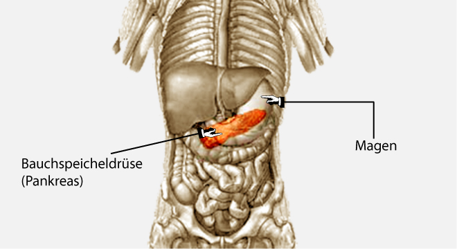 Die Bauchspeicheldrüse (Pankreas) ist ein für die Verdauung wichtiges Organ. Sie liegt im oberen Bauchraum etwa auf Höhe der Nieren und ist im Bogen des Zwölffingerdarmes eingebettet.