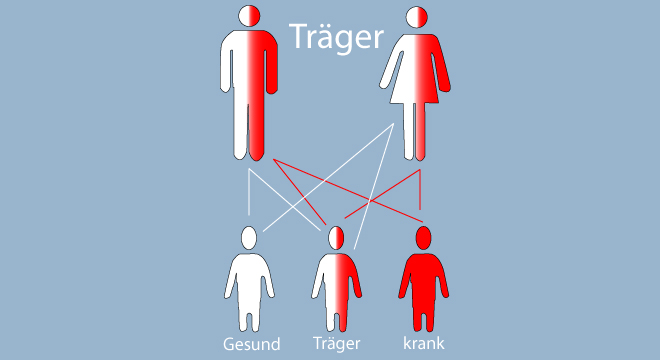 Ein Kind leidet dann unter einer Cystischen Fibrose, wenn beide Elternteile per Zufall Genträger sind und das Kind von beiden Eltern das veränderte Erbgut erhält. Diese Chance besteht beim Kind von 2 Trägern zu 25%.
