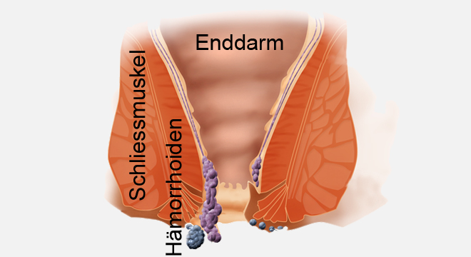 Hämorrhoiden sind erweiterte, arteriovenöse Blutgefässpolster, die ringförmig unter der Enddarmschleimhaut am After vorkommen. Diese Gefässpolster dienen dem Feinverschluss des Afters. Man unterscheidet zwischen inneren (im Afterkanal) und äusseren Hämorrhoiden.