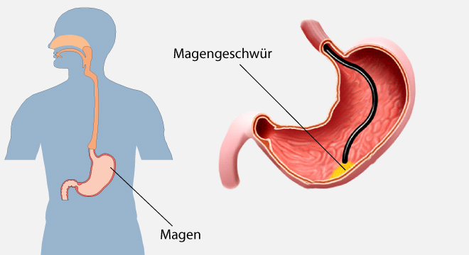 Magengeschwüre sind Schleimhautdefekte im Magen oder Zwölffingerdarm. In leichten Fällen ist lediglich die oberste Schleimhautschicht beschädigt. In schwereren Fällen ist es ein Defekt in der Magenwand.