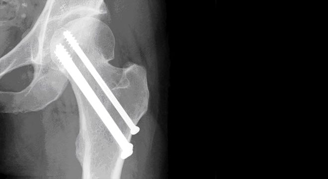 Dynamische Hüftschraube (Metallplatten und Schrauben-Konstruktion): Hier wird zur Stabilisierung eine Metallplatte am Oberschenkel befestigt und eine dicke Schraube durch den Schenkelhals in den Hüftkopf gelegt. Auch diese Operation kann nur bei guter Knochendichte des Patienten vorgenommen werden.