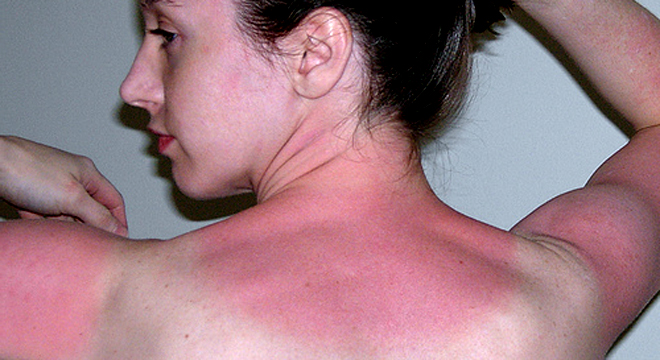Die Haut zeigt die typischen Anzeichen einer Entzündung: sie ist gerötet, heiss, schwillt an und schmerzt oder juckt. Bei noch stärkerer Bestrahlung kann es sogar bis zu einer Verbrennung zweiten Grades mit Blasenbildung kommen. Achtung: Blasen dürfen nicht selber geöffnet werden, da es sonst zu Infektionen kommen kann. Zu den beschriebenen Symptomen können bei schwerem Sonnenbrand gelegentlich auch Fieber, Müdigkeit oder Übelkeit hinzukommen.