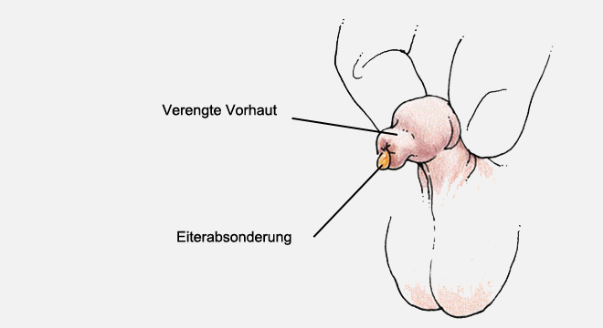 Eine Phimose entsteht durch die Verklebung der Vorhaut mit der Eichel oder Vernarbung der Vorhaut, so dass sich diese nicht mehr zurückschieben lässt. Von Paraphimose spricht man, wenn die Vorhaut nach gewaltsamem Zurückstreifen eine Schwellung der Eichel verursacht und nicht mehr vorgeschoben werden kann. Dies ist ein Notfall, falls es nicht gelingt, durch Druck auf die Eichel und Massage die Schwellung zu verringern und die Vorhaut wieder nach vorne zu schieben.