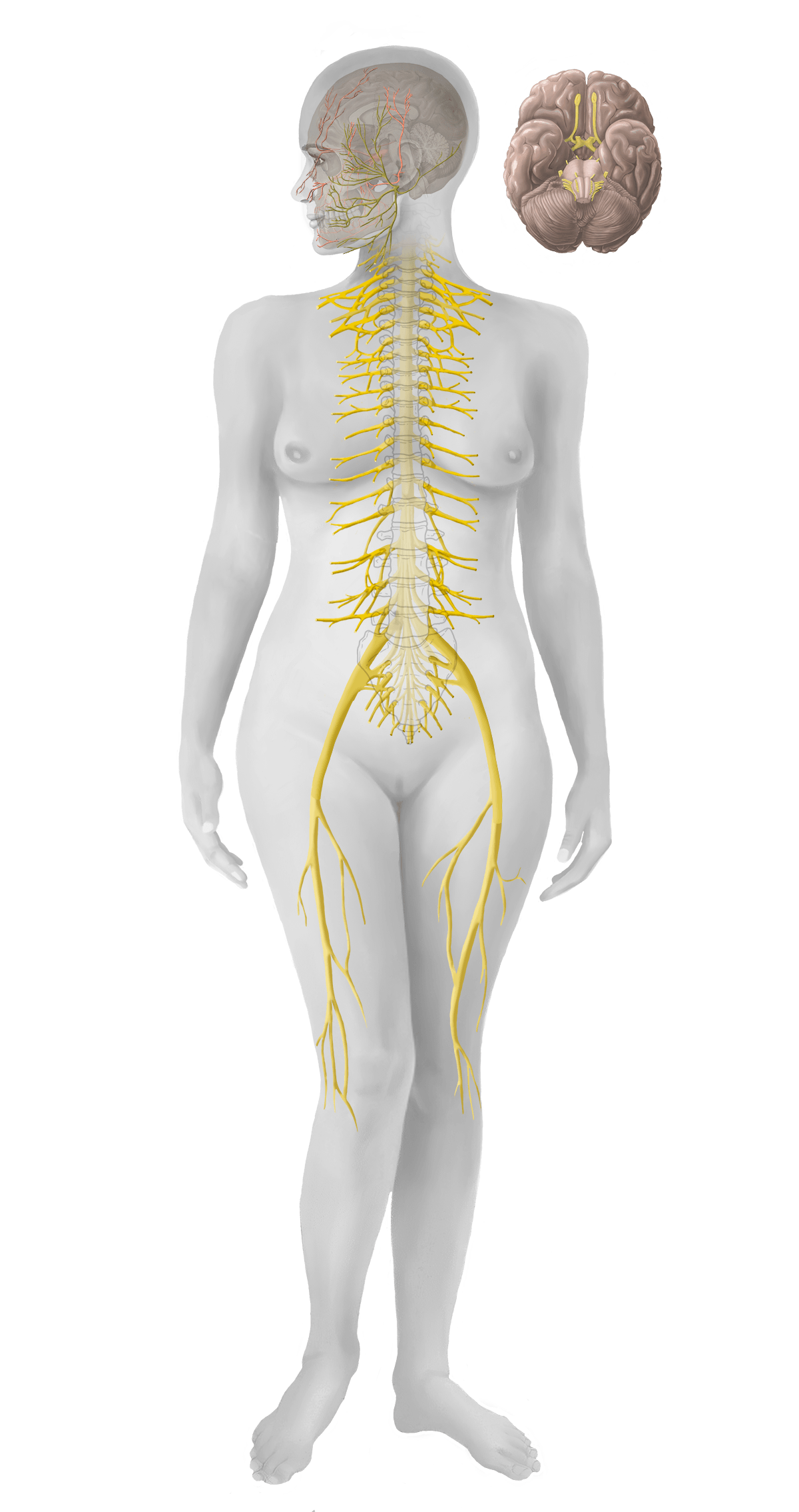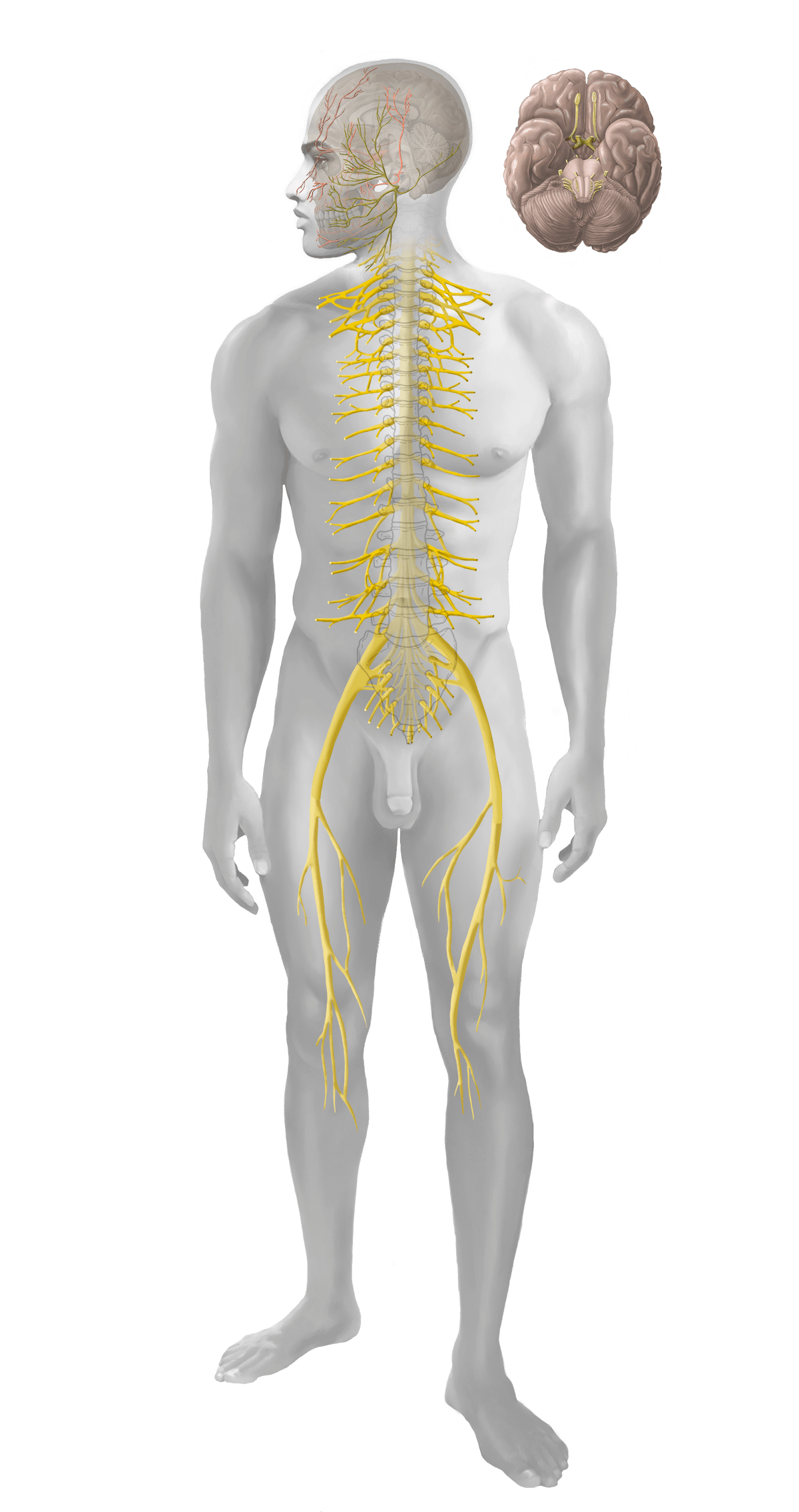 Der 1. Hirnnerv ist der Riechnerv für den Geruchsinn. Der 2. Hirnnerv ist der Sehnerv, der die Signale von der Netzhaut im Auge zum Hirn leitet. Die Hirnnerven 3, 4 und 6 steuern unter anderem die Augenbewegungen. Der 5. Hirnnerv ist der Drillingsnerv (Trigeminus), der sich in einen Augenast, einen Unterkieferast und einen Oberkieferast aufteilt. Der Trigeminus ist für das Gefühl im Gesicht zuständig und steuert die Kaumuskulatur. Der 7. Hirnnerv (Facialis) ist für die Mimik im Gesicht und für das Geschmacksempfinden der vorderen zwei Drittel der Zunge verantwortlich. Der 8. Hirnnerv ist der Hör- und Gleichgewichtsnerv. Der 9. Hirnnerv ist der Zungengeschmacksnerv, der für das Geschmacksempfinden der hinteren Zunge verantwortlich ist und zusammen mit dem 10. Hirnnerv den Gaumen und das Schlucken steuert. Der 10. Hirnnerv (Vagus-Nerv) beeinflusst die Herzfunktion und die Funktion anderer Organe, er steuert auch die Stimmritze und damit die Tonbildung und zusammen mit dem 9. Hirnnerven den Gaumen und das Schlucken. Der 11. Hirnnerv ist der Schulter- und Nackenmuskelnerv und steuert die Kopfdrehung. Der 12. Hirnnerv bewegt die Zunge.