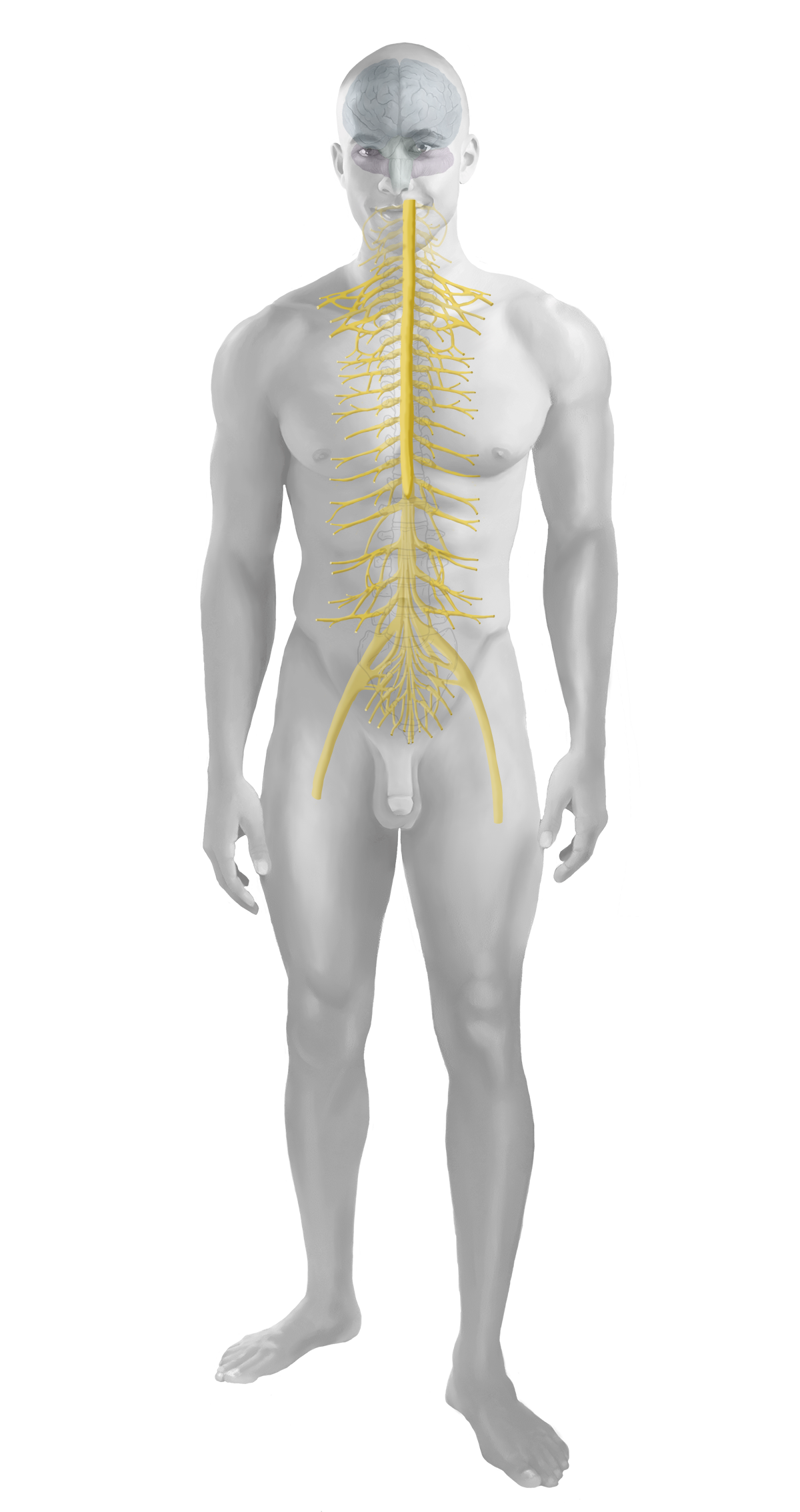 Das Rückenmark bildet mit dem Gehirn zusammen das zentrale Nervensystem. Es verbindet das Gehirn mit den Spinalnerven, die vom Rückenmark abgehen. Das Rückenmark verläuft im Rückenmarkkanal der Wirbelsäule und wird durch die Wirbelkörper und Wirbelbögen geschützt. Es reicht vom verlängerten Mark unterhalb der Schädelbasis bis hinab zum zweiten Lendenwirbel. Unterhalb davon ist das Rückenmark stark verkümmert und sieht aufgrund der auslaufenden gebündelten Nervenfasern wie ein Pferdeschweif aus. Das Rückenmark besteht aus einer grauen und weissen Substanz. Zentral liegt die graue Substanz, die im Querschnitt wie ein Schmetterling aussieht und aus unzähligen Nervenzellen gebildet wird. Die weisse Substanz umschliesst die graue Substanz und enthält hauptsächlich die langen Nervenfasern. Das Rückenmark ist wie das Gehirn von Rückenmarkflüssigkeit (Liquor) und von drei schützenden Rückenmarkhäuten umgeben: eine harte äussere Haut, eine gut durchblutete mittlere Haut und eine weiche dem Rückenmark direkt aufliegende innere Haut.