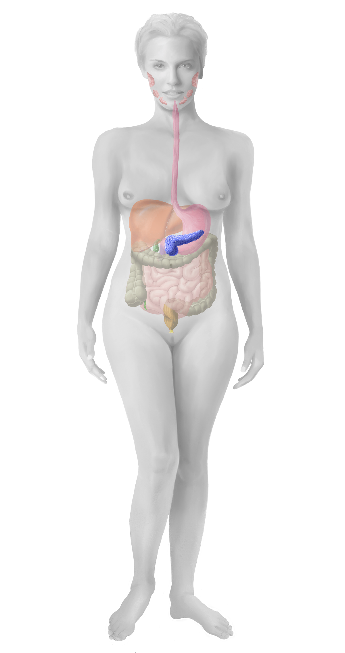 Die Bauchspeicheldrüse (Pankreas) gehört zum Verdauungstrakt. Das keilförmige Organ bestehend aus einem Kopf, Körper und Schwanz, ist etwa 15 Zentimeter lang und liegt quer im Oberbauch direkt hinter dem Magen. Die Bauchspeicheldrüse hat zwei wesentlich Aufgaben: Sie produziert einen Verdauungssaft (Bauchspeichel), der über den Bauchspeicheldrüsengang in den Zwölffingerdarm geleitet wird. Der Saft enthält verschiedene Enzyme zur Aufspaltung der Nahrungsbestandteile (Eiweisse, Kohlenhydrate, Fette). Ausserdem neutralisiert das Sekret die zuvor in die Nahrung gelangte Magensäure, damit die empfindliche Darmschleimhaut nicht von der Säure angegriffen wird. Die zweite Aufgabe ist die Produktion der Hormone Insulin und Glukagon, die als Gegenspieler den Blutzucker regulieren. Insulin wirkt blutzuckersenkend, Glukagon blutzuckersteigernd. Wenn der Blutzuckerspiegel steigt, beispielsweise nach einer Mahlzeit, gibt die Bauchspeicheldrüse Insulin ins Blut ab, wodurch der Zuckerspiegel sinkt. Wenn umgekehrt der Blutzuckerspiegel zu niedrig ist, wird Glukagon abgegeben.