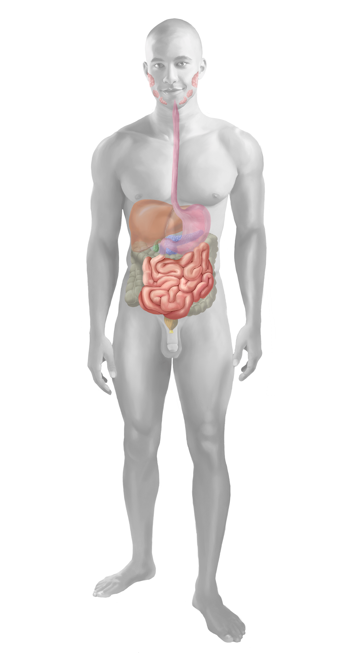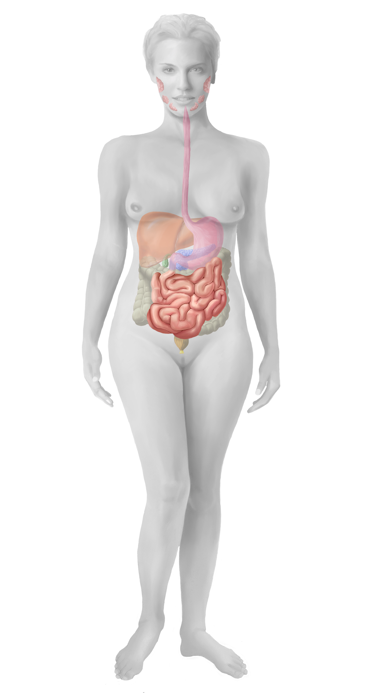 Der Dünndarm schliesst sich an den Zwölffingerdarm an und besteht aus zwei Abschnitte: Leerdarm (Jejunum) und Krummdarm (Ileum). Mit ihren zahlreichen Windungen erreichen sie eine Länge von insgesamt 6 Metern und nehmen daher den meisten Platz im Bauchraum ein. Im Dünndarm findet die eigentliche Verdauung statt, das heisst, die Aufspaltung und Aufnahme (Resorption) der Nährstoffe aus der Nahrung. Die Innenseite des Dünndarms ist faltig und besitzt unzählige kleine Ausstülpungen, die Darmzotten, wodurch die Resorptionsfläche stark vergrössert wird. Die Nährstoffe gelangen über die Darmschleimhaut ins Blut und werden über die Pfortader zur Leber transportiert.