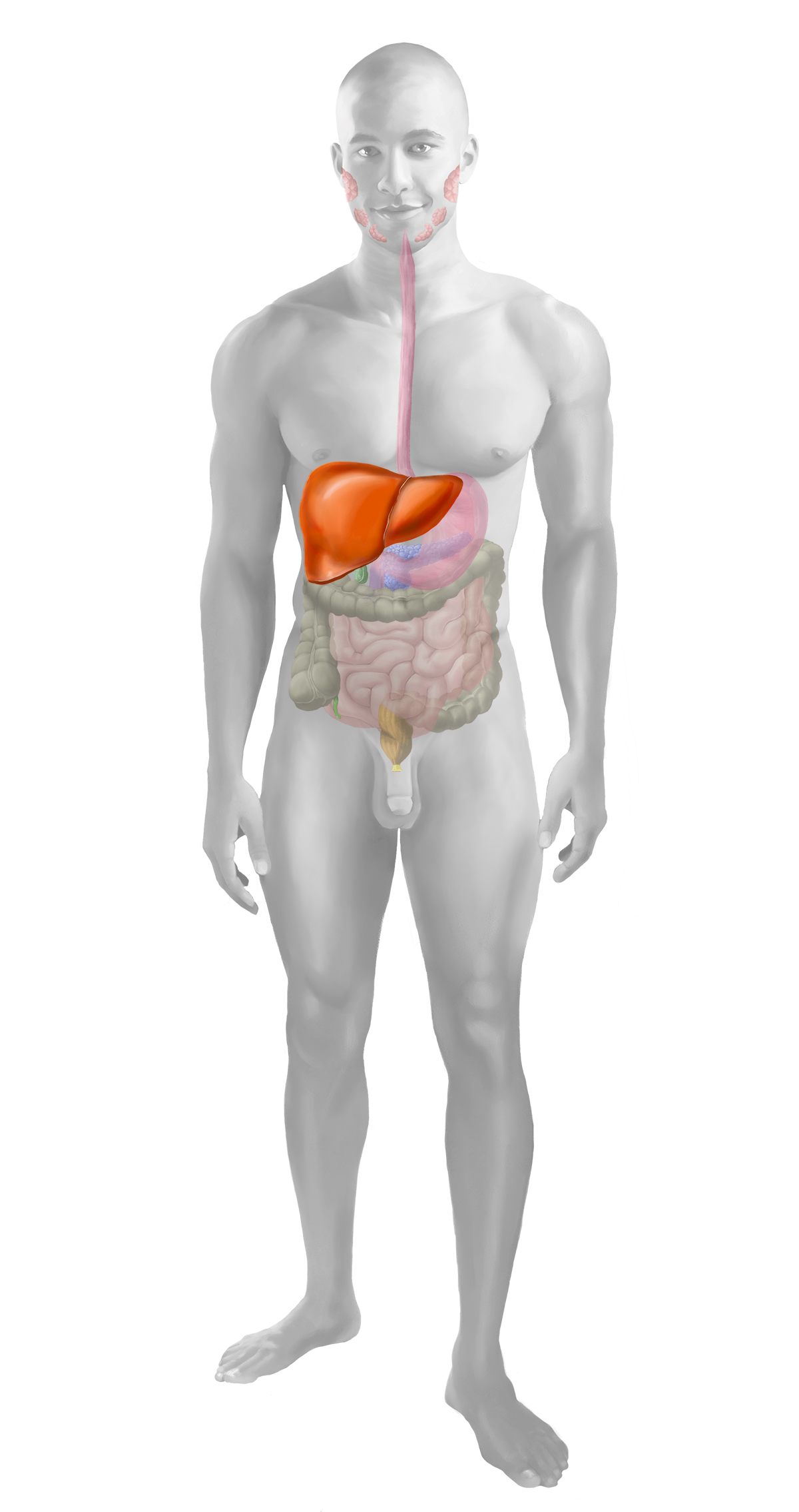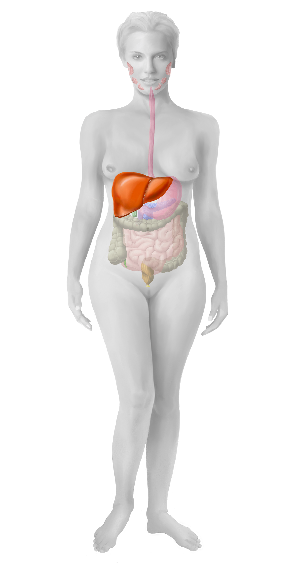 Die Leber ist das wichtigste Stoffwechselorgan, dessen grösster Teil im rechten Oberbauch direkt unter dem Zwerchfell und unter dem rechten Rippenbogen liegt. Sie besteht aus einem grossen rechten Lappen und einem kleineren linken Lappen und besteht aus Milliarden von Leberzellen (Hepatozyten). Die Leber erfüllt viele lebenswichtige Aufgaben: Sie ist gleichzeitig Entgiftungszentrale, Stoffwechselorgan, Speicherorgan und Produktionsstätte zahlreicher Stoffe. Ausserdem ist die Leber am Hormonhaushalt und an der Immunabwehr beteiligt. Als Entgiftungsorgan verhindert sie, dass Schadstoffe aus der Nahrung in den Körperkreislauf gelangen. Schädliche Substanzen und andere Stoffe im Blut wie Medikamente werden in der Leber abgefangen und in den Leberzellen "entgiftet", das heisst zu unschädlichen Stoffen umgewandelt. Alles was sie nicht verwerten kann, gibt sie als Abfallstoffe an die Nieren weiter zur Ausscheidung über den Urin. Als Stoffwechselorgan ist die Leber an nahezu allen Stoffwechselvorgängen im Körper beteiligt. Sie nimmt über den Blutkreislauf Nährstoffe aus dem Darm auf, baut sie um und speichert sie ab. Insbesondere Zucker (als Glykogen), Vitamine und Eisen werden in der Leber gespeichert, die sie bei Bedarf wieder freigibt. Wird zu viel gegessen und sind die Glykogenspeicher voll, wird der überschüssige Zucker in Fett umgewandelt und als Fettpolster gespeichert. Die Leber ist aber auch Produktionsstätte vieler lebenswichtiger Stoffe. In den Leberzellen werden unter anderem Cholesterin, Zucker, Eiweisse und Enzyme der Blutgerinnung gebildet. Ausserdem produziert die Leber die Galle, die in der Gallenblase zwischengespeichert wird und von dort portionsweise über den Gallengang in den Zwölffingerdarm gelangt. Die Galle erleichtert die Fettverdauung. Bekanntlich wird auch Alkohol in der Leber abgebaut. Kleinere Mengen werden von ihr problemlos bewältigt. Bei grösseren Mengen, vor allem über längeren Zeitraum, werden die Leberzellen jedoch irreparabel geschädigt (Leberzirrhose).